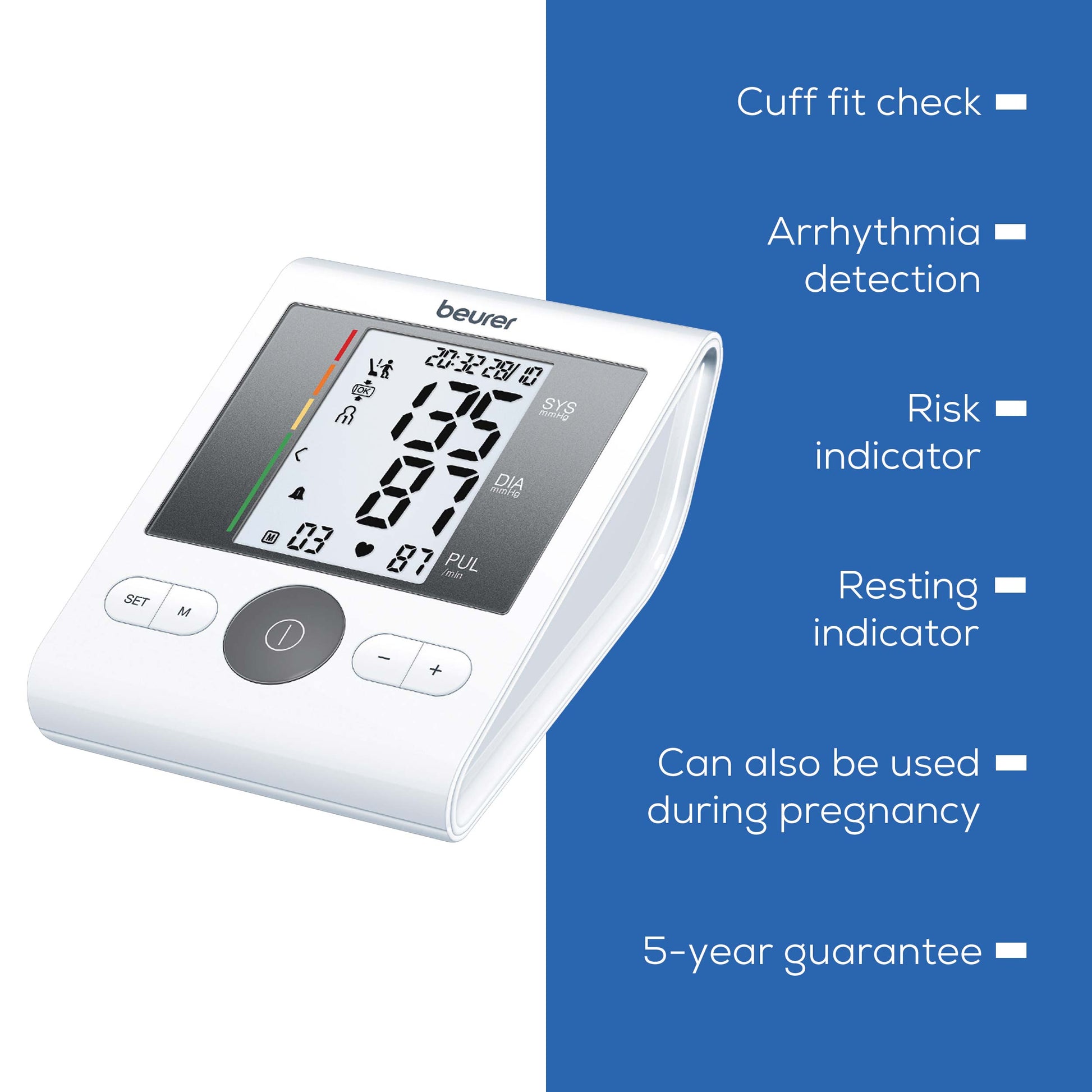 The Beurer BM 28 Upper Arm Blood Pressure Monitor has a universal cuff that is also suitable for larger upper arm circumferences up to 42 cm. The patented resting indicator shows you whether haemodynamic stability is achieved during the measurement and the measured values are therefore comparable. The integrated cuff fit check provides added peace of mind about the accuracy of the measured blood pressure values during every measurement. In addition, the measurement accuracy of the BM 28, including during pregnancy.