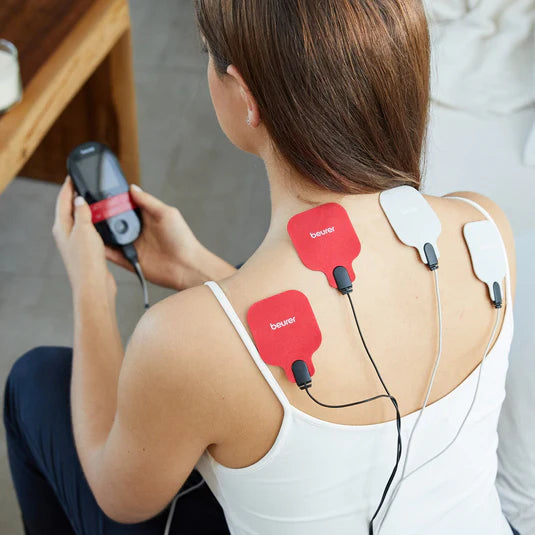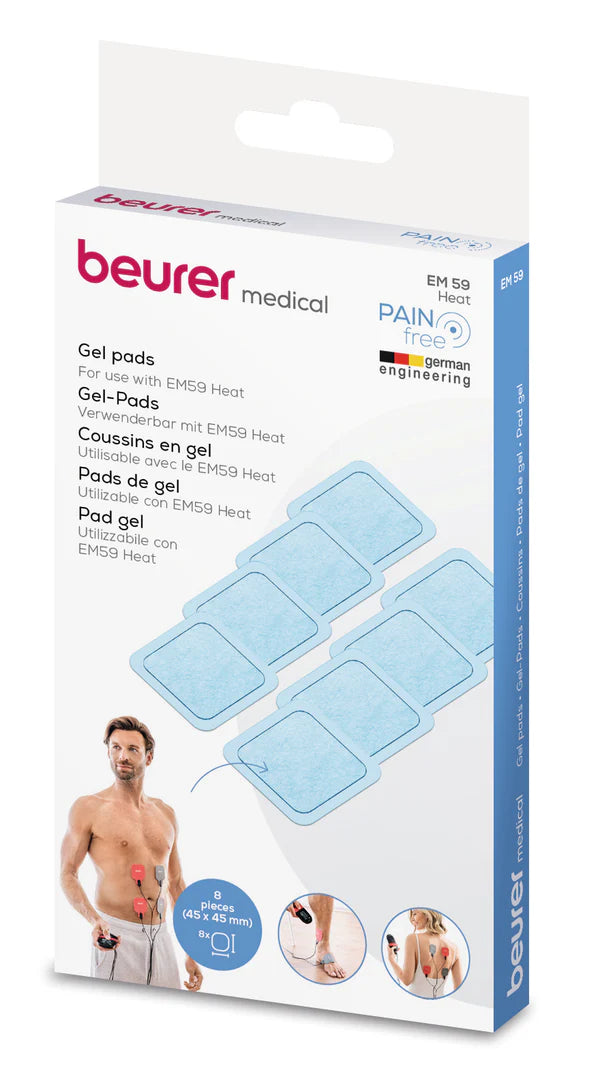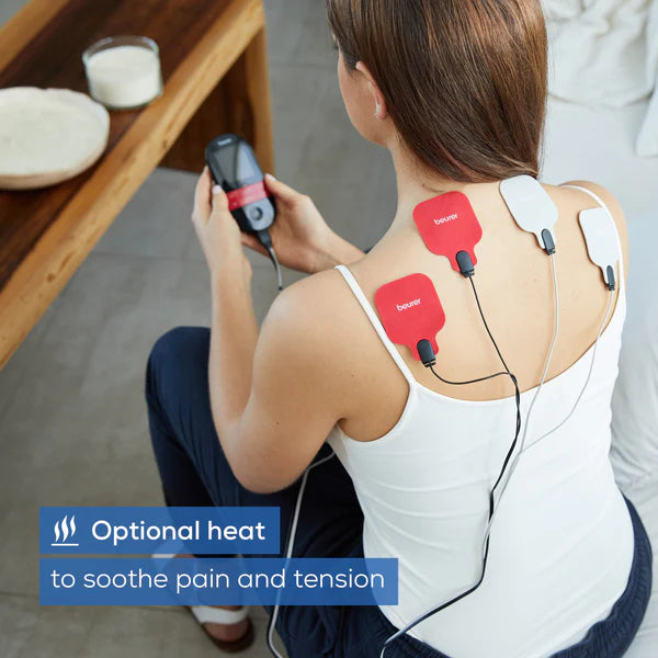 The EM 59 Heat Stimulation Current Device from Beurer including 4 gel pads provides 4 central functions in just one device. In addition to transcutaneous electrical nerve stimulation (TENS) for pain relief, you can also use it for electrical muscle stimulation (EMS) alongside your training or for regeneration. A massage function and a heat program round off the product’s features.