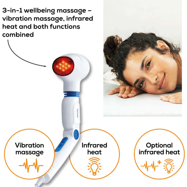 It’s time to relax and treat yourself to a soothing vibration massage with the MG 40 from Beurer. The rotating massage head and 3-way adjustable handle also make it ideal for use on the back. The massager contains 4 different massage attachments to intensify the massage effect. In addition, the infrared light can relieve tension.